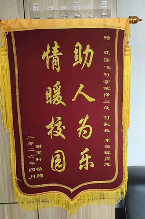 近日,我校一名学生将一面印有“助人为乐,情暖校园”的锦旗送到学校保卫处,对保安人员在其遇到困难时伸出援手、热心相助表示衷心感谢。